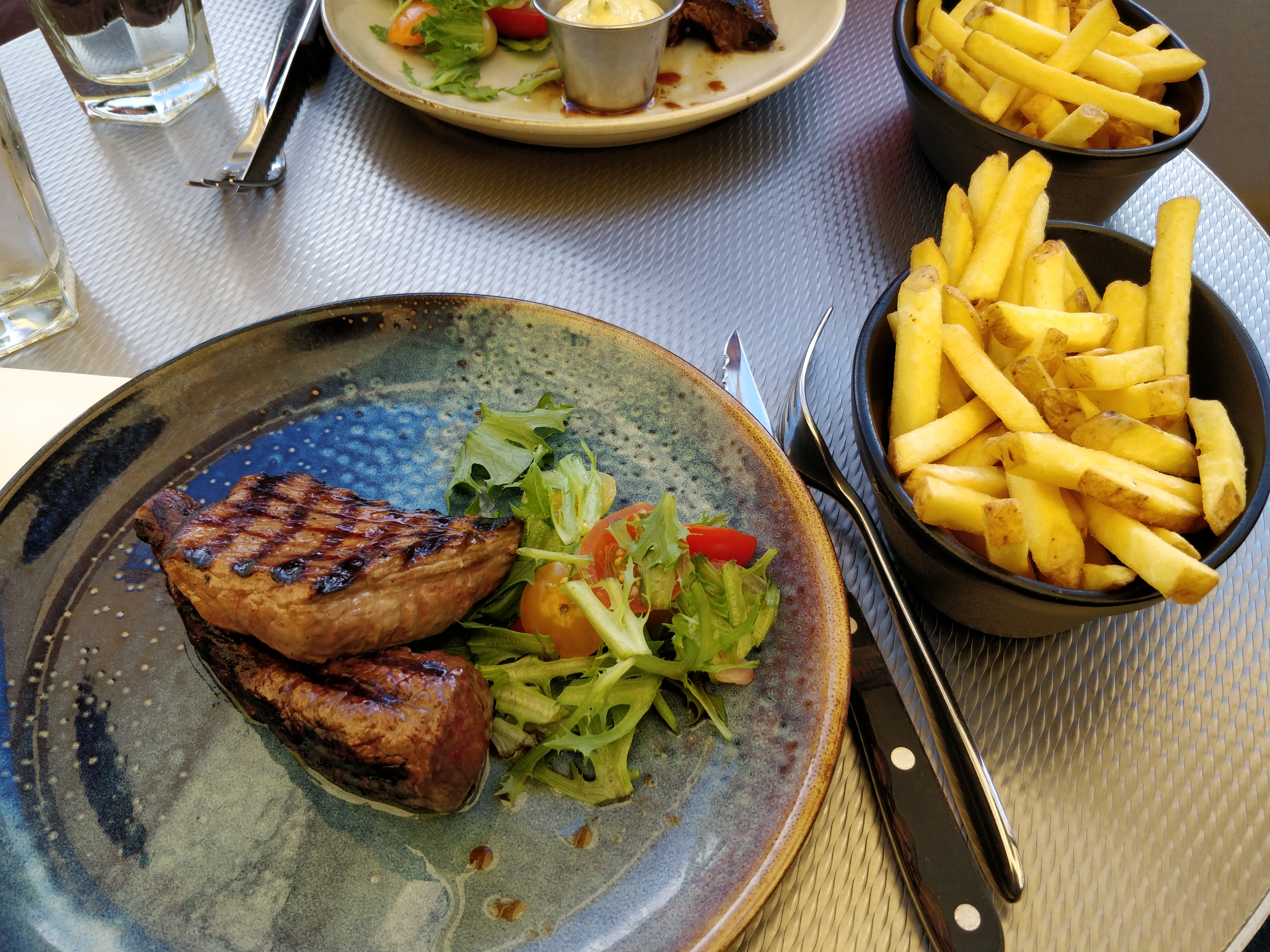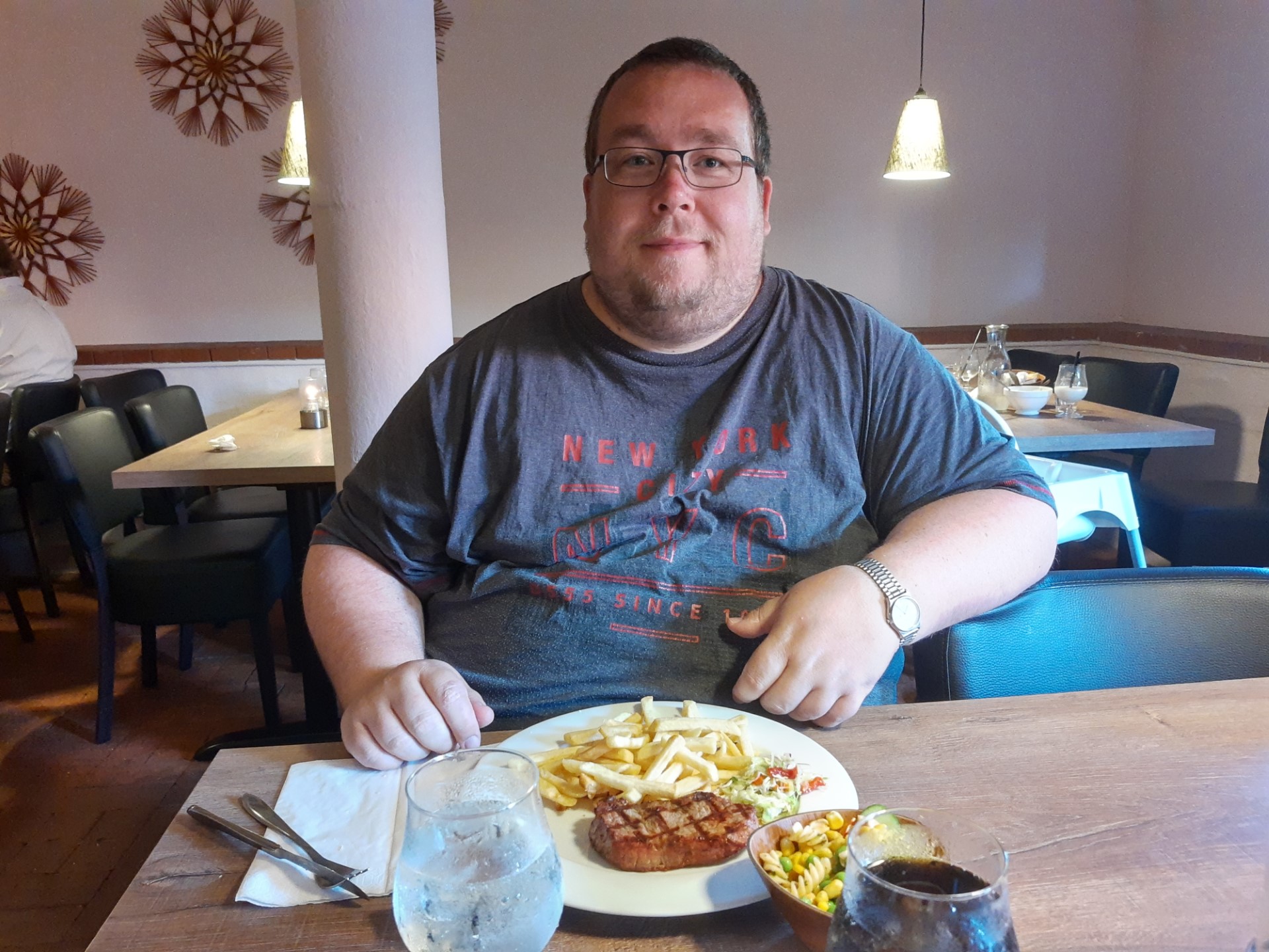 Vi havde begge fået rigeligt med sol og varme, og vi trængte begge til en timeout. Så vi kørte hjem til Boderne og tog en pause inden aftensmaden. Vi havde bestemt at vi ville spise på Pakhuset i Svaneke, så der kørte vi ind til aften. Maden var OK, men drikkevarerne var smagsløse. Men det oplever vi tit.