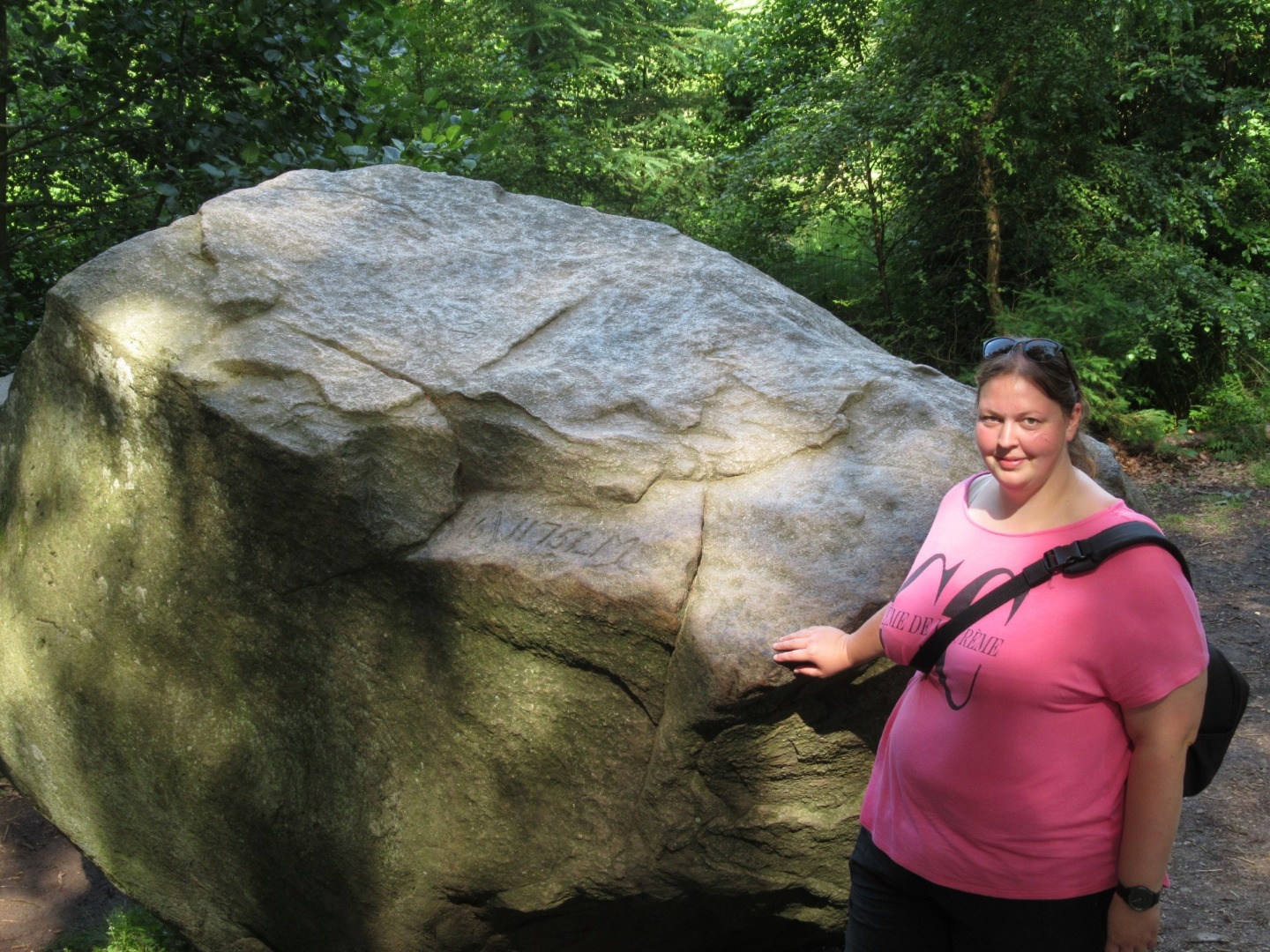 Efter vores bison-eventyr kørte vi mod Paradisbakkerne nær Nexø, for at se den "rigtige" rokkesten. Der er åbenbart flere rokkesten på Bornholm - men nu vil vi se Rokkestenén! Det var vi ikke de eneste der ville... Vi har generelt bemærket, at der i løbet af de sidste par dage er kommet RIGTIGT MANGE turister til øen. Så vi er begge glade for, at vores Bornholms-tur er ved at være slut. Men parkeringspladsen ved Rokkestenen var i hvert fald fuld. Så vi måtte parkere langs vejen i stedet. På vej ind til Rokkestenen havde vi læst, at man kunne skyde genvej ved at gå til venstre, på et eller andet tidspunkt... Men det var TYDELIGVIST ikke der hvor vi valgte at gå til venstre. Vi kom ud på en sti (hvis man kan kalde den det), som gik i svært fremkommeligt terræn, op og ned, ad klipper og bakker i skoven, med trærødder som hele tiden prøvede at spænde ben for os. Vi var lige ved at give op, men fortsatte alligevel frem, indtil vi - omsider og heldigvis - nåede Rokkestenen. Vi fik taget de obligatoriske billeder, og Thomas var lige ved at vælte Rokkestenen omkuld i sit forsøg på at rokke den. På tilbagevejen fulgte vi den afmærkede rute, som gik ad en næsten plan grussti, hele vejen tilbage til parkeringspladsen...!!!