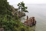 Naboen til Døndalen er Helligdomsklipperne, så vi trillede bilen over på modsatte side af vejen, hvor vi så nogle af Helligdomsklippernes rå brutaliteter. Udsigten ned over klippeblokkene er smuk, og i baggrunden kunne vi se Ertholmene.