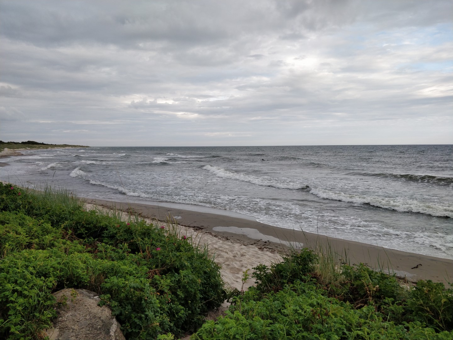 Ved 16-tiden kørte vi til Arnager. Først en tur ned til stranden for at se bølgerne, og derefter op til Arnager Røgeri, hvor vi spiste tidlig aftensmad. Aftensmaden blev en røgeriplatte med røget sild, makrel og laks samt en portion fiskefillet og pommes frittes til deling. Vi var jo nødt til at smage på nogle af de lokale delikatesser inden vi vender næsen hjemad igen.