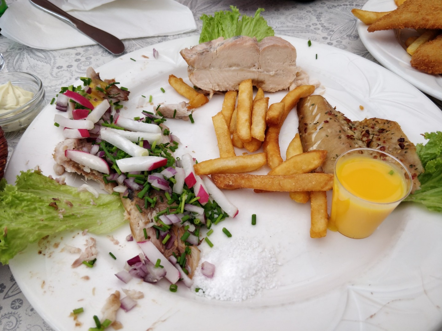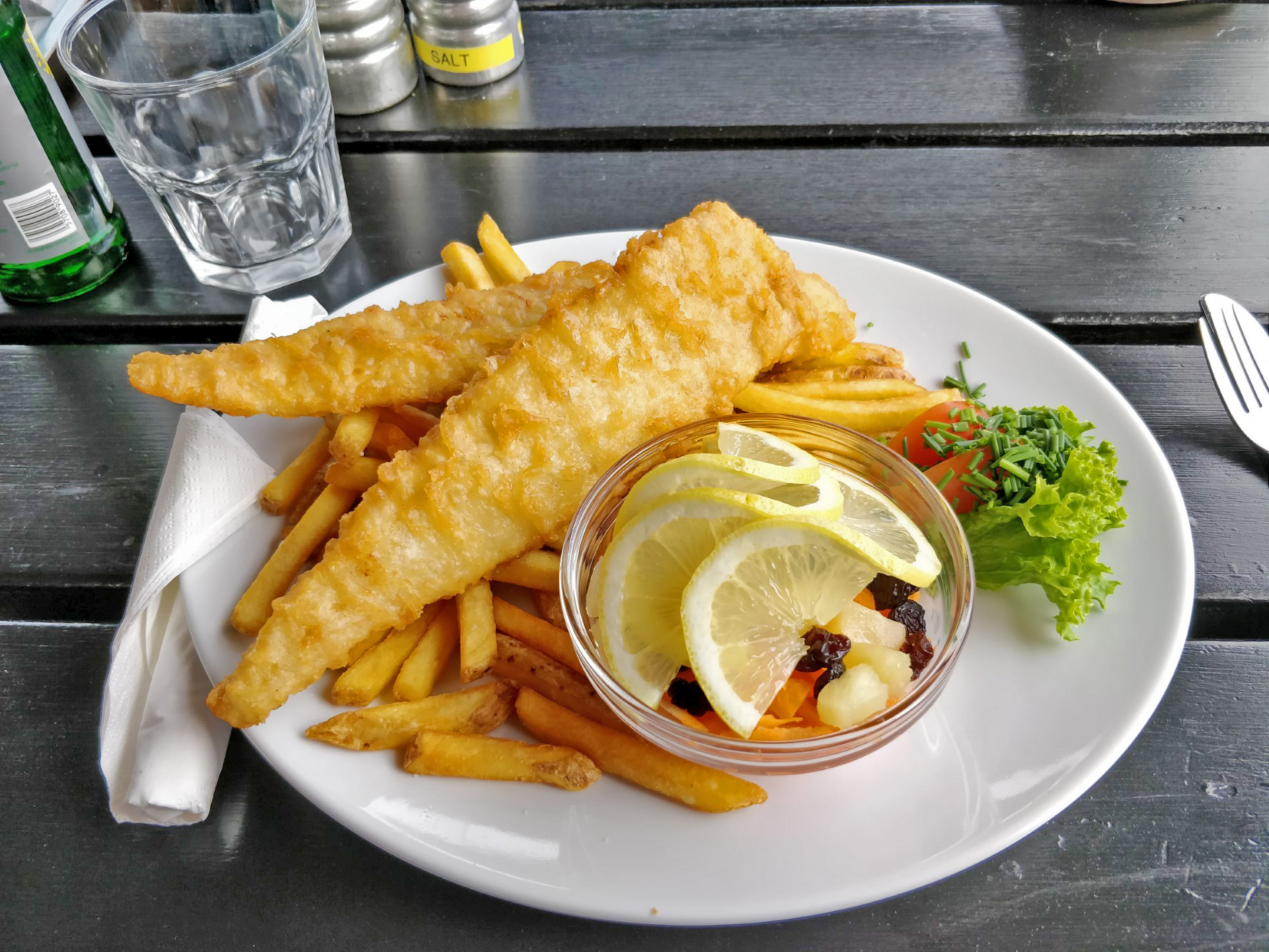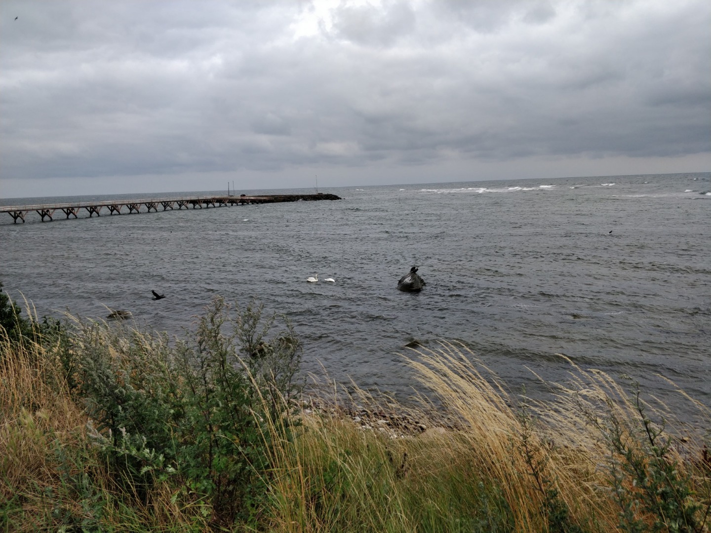 Vi var stadig lidt sultne, så vi kørte fra Bisonskoven imod Nexø, hvor vi havde hørt om et røgeri, som serverer andet end sild. De havde heldigvis både plads og tid til at fodre os! Mens vi spiste rullede et stort regn- og tordenvejr forbi os, så vi blev siddende og ventede på at det drev over. Vi købte nogle fiskefrikadeller som vi tog med hjem, til den sene aftensmad.