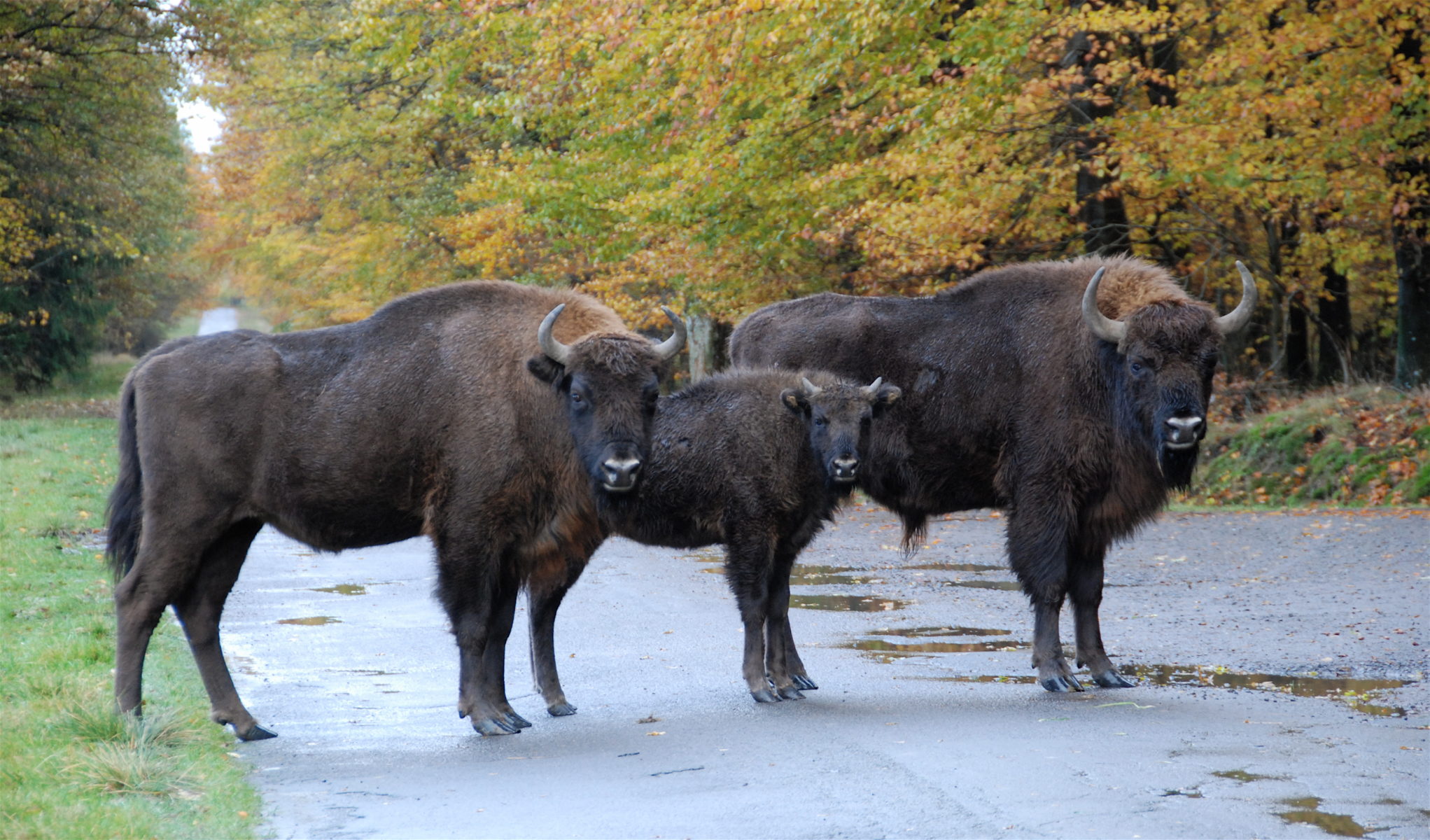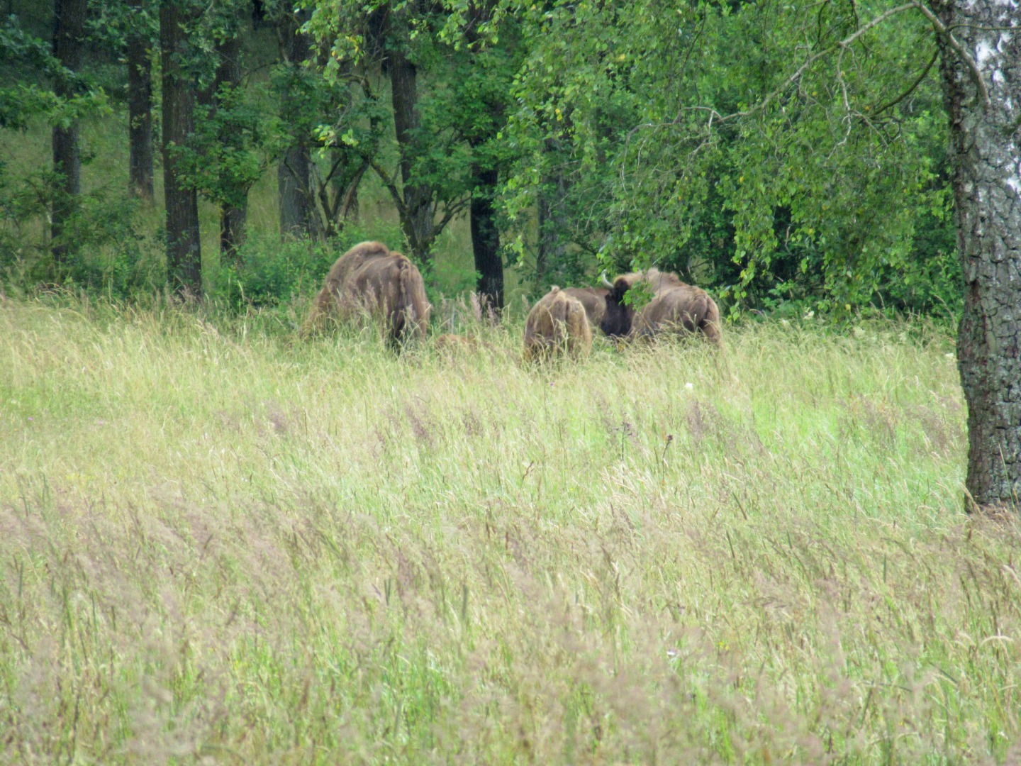 Halvvejs igennem Bisonskoven blev vi stoppet af en lokal Bornholmer på cykel, som sagde at han havde set dem en kilometer nede af en skovvej, ved en lysning. Så vi smed bilen på en parkeringsplads, og vandrede ned til lysningen. Foran os gik der fire tyskere, som åbenbart ikke vidste at bison'erne er sky, og derfor talte de meget højt sammen. Da vi nåede til lysningen så både vi og tyskerne en flok på 4-5 bisonokser, men de både så og hørte også os (eller i hvert fald tyskerne), og derfor fortrak de ind i skoven igen. Ærgerligt, men vi fik da lige set dem, og fik skudt et par billeder af dem.
