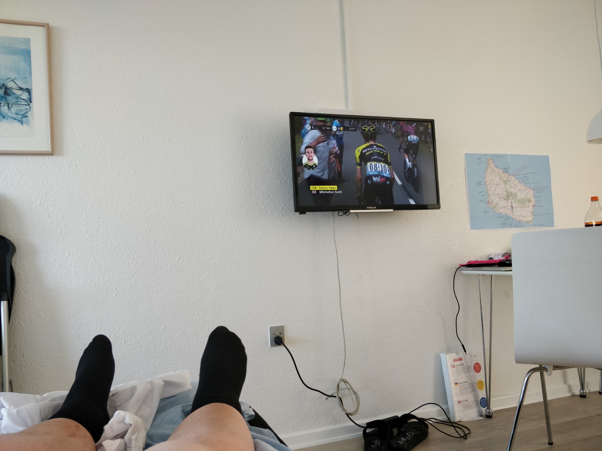 Vi syntes det var for tidligt at spise, så vi kørte hjem til Boderne. Her fik Lone dyppet sine tær i vandet, og Thomas fik set afslutningen på dagens etape i Tour de France.