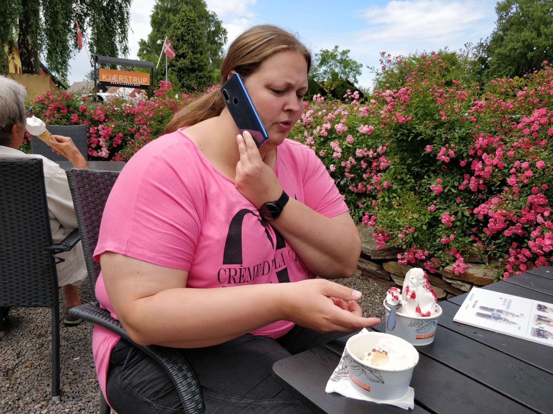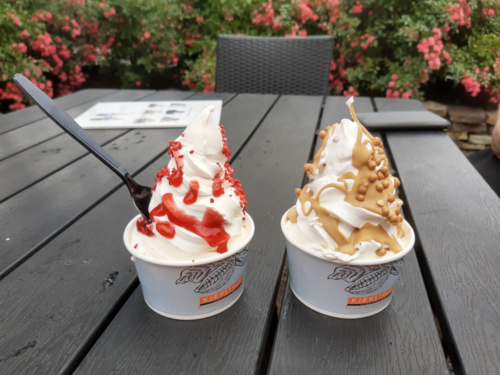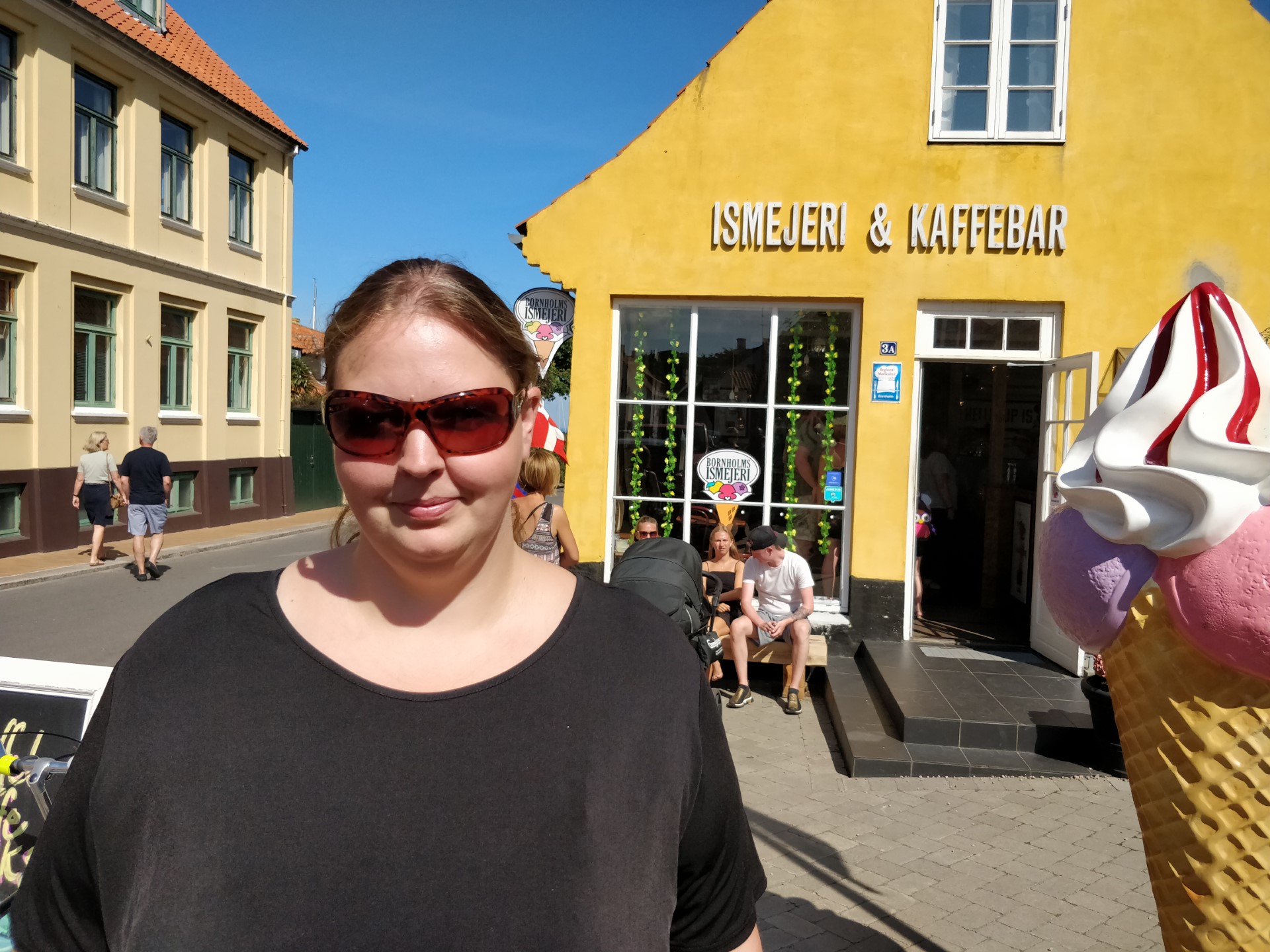 Turen gik videre til Gudhjem, hvor vi trillede bilen ned gennem de stejle gader i zigzak mellem turisterne. Der var godt fyldt op, og det var svært at finde en ledig parkeringsplads, så vi besluttede, at vi havde set nok af Gudhjem i denne omgang. I stedet for fortsatte vi ned langs den smukke kyststrækning til Snogebæk, hvor vi havde hørt, at man kan få en flødebolleis. Den var dyr, men når man har hørt om en bornholms flødebolleis, så kan man vel ikke forlade Bornholm uden at have smagt sådan en! Thomas fik en med karamel og Lone en med hindbær. De smagte begge godt, og smagsfordelingen viste sig at være helt perfekt 😁
