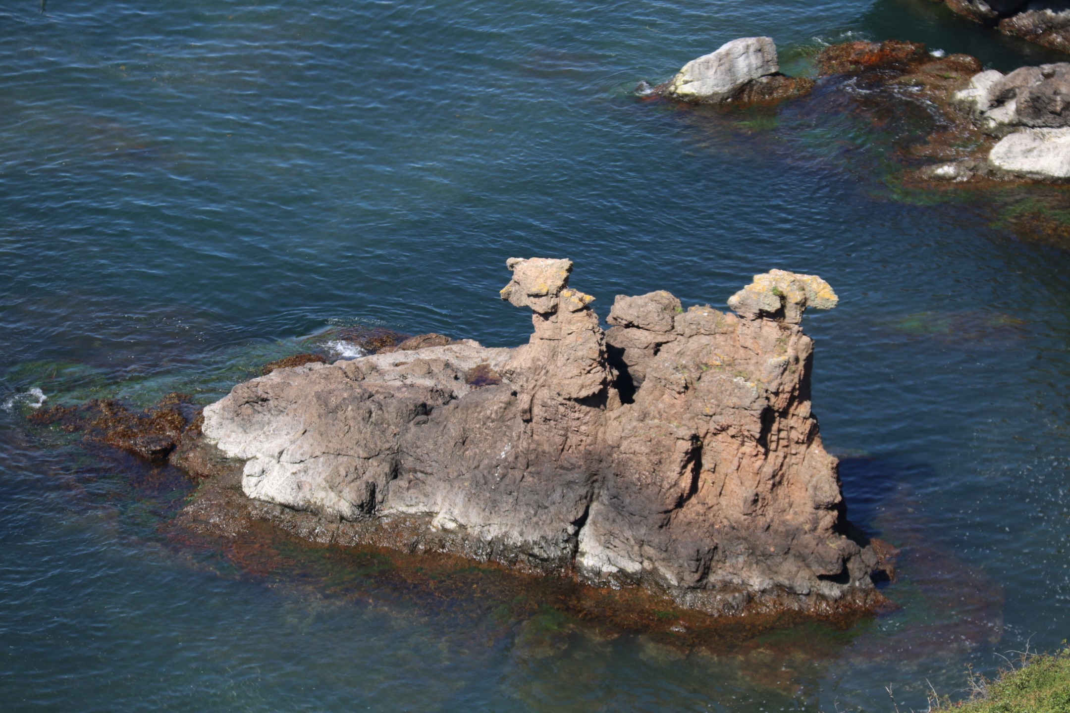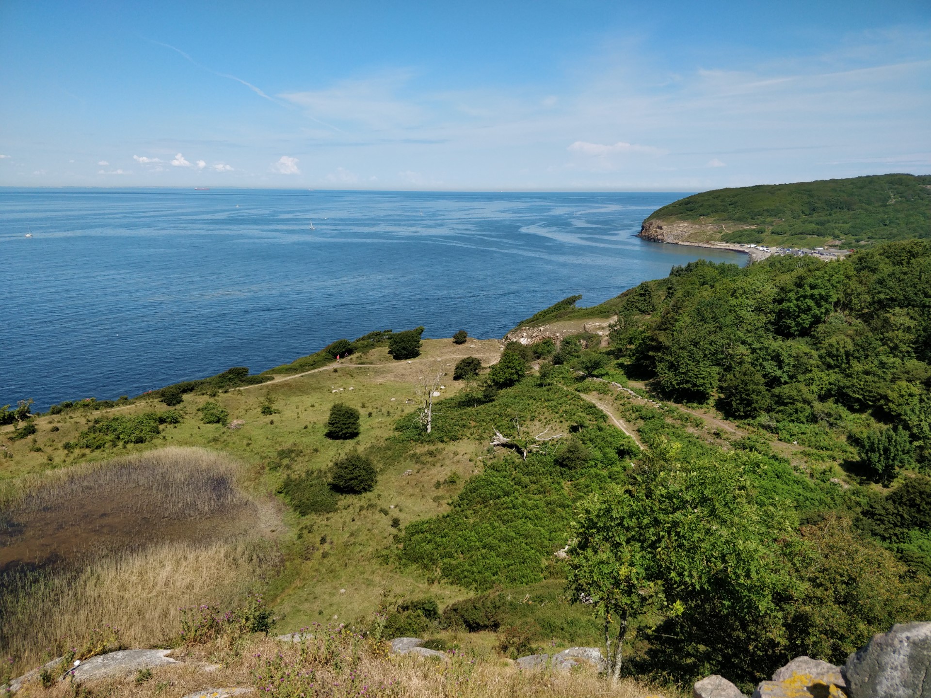 Naboen til Døndalen er Helligdomsklipperne, så vi trillede bilen over på modsatte side af vejen, hvor vi så nogle af Helligdomsklippernes rå brutaliteter. Udsigten ned over klippeblokkene er smuk, og i baggrunden kunne vi se Ertholmene.