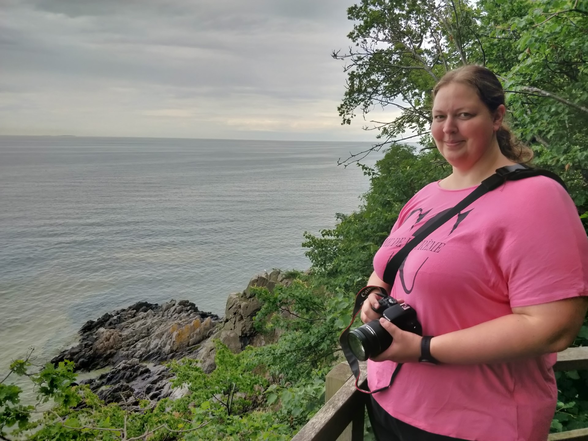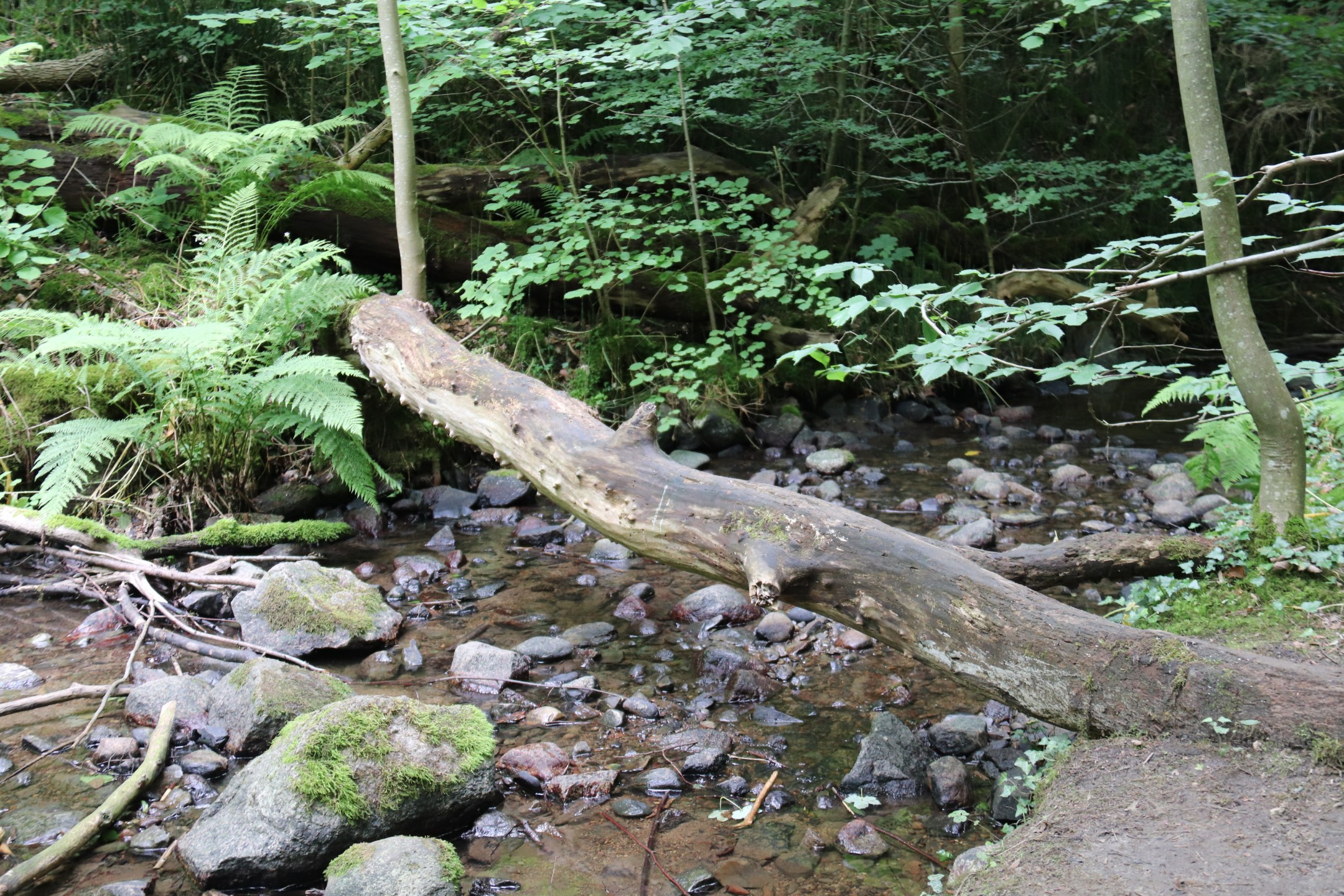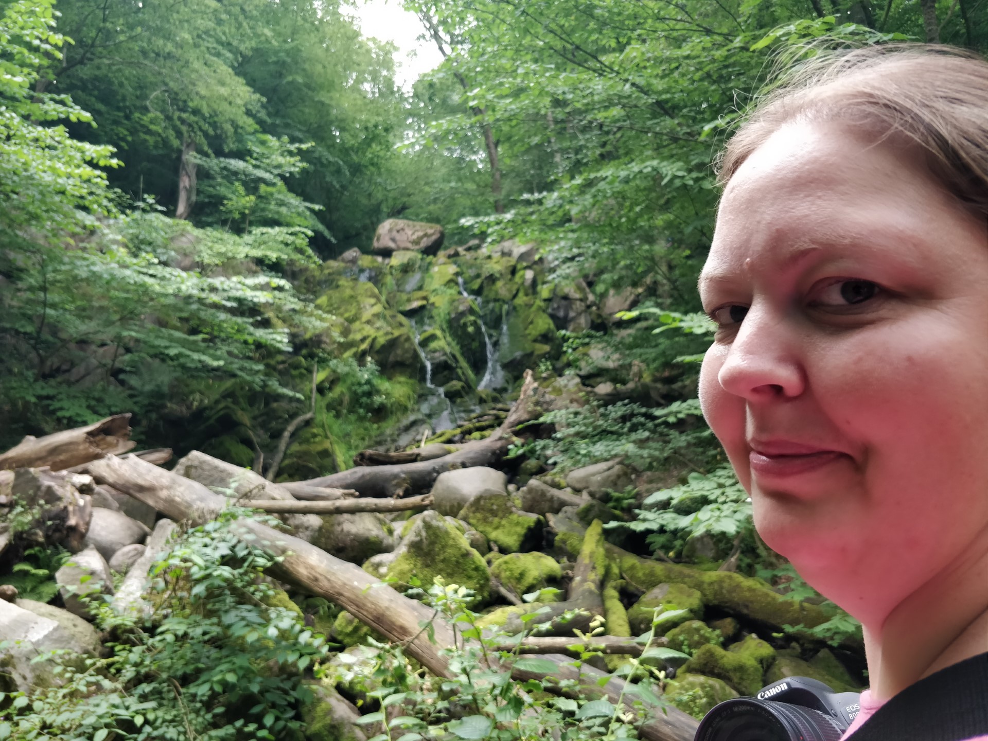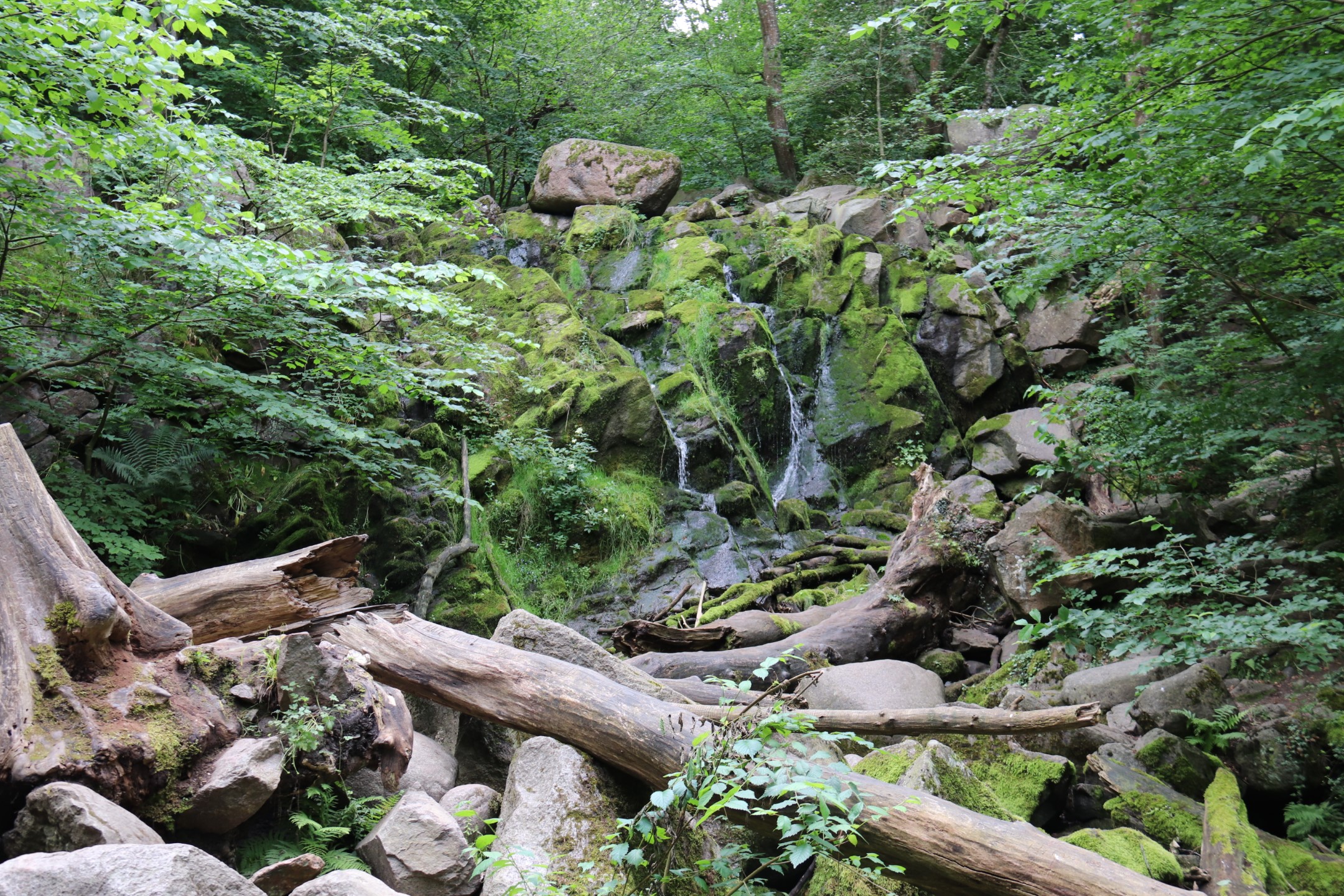 Billeder:Vejrudsigten havde ellers lovet fremragende vejr på resten af vores bornholmertur. I dag var der dog kommet små lette regnbyger på vejrudsigten omkring middagstid, så vi kom lidt hurtigere ud af starthullerne end vi ellers har gjort. Dagens mål var Døndalen, som huser Danmarks højeste vandfald. Turen ind gennem skoven var idyllisk, selv om begejstringen steg og faldt i takt med stigninger og fald i skovstiens højdemeter. Vandfaldet var fint og hyggeligt, selv om der ikke var så meget vand i, som man nok kan opleve i løbet af årets andre årstider. Noget af idyllen forsvandt dog i tilstedeværelsen af andre turister, som havde fået forvildet sig ned ad samme skovsti.