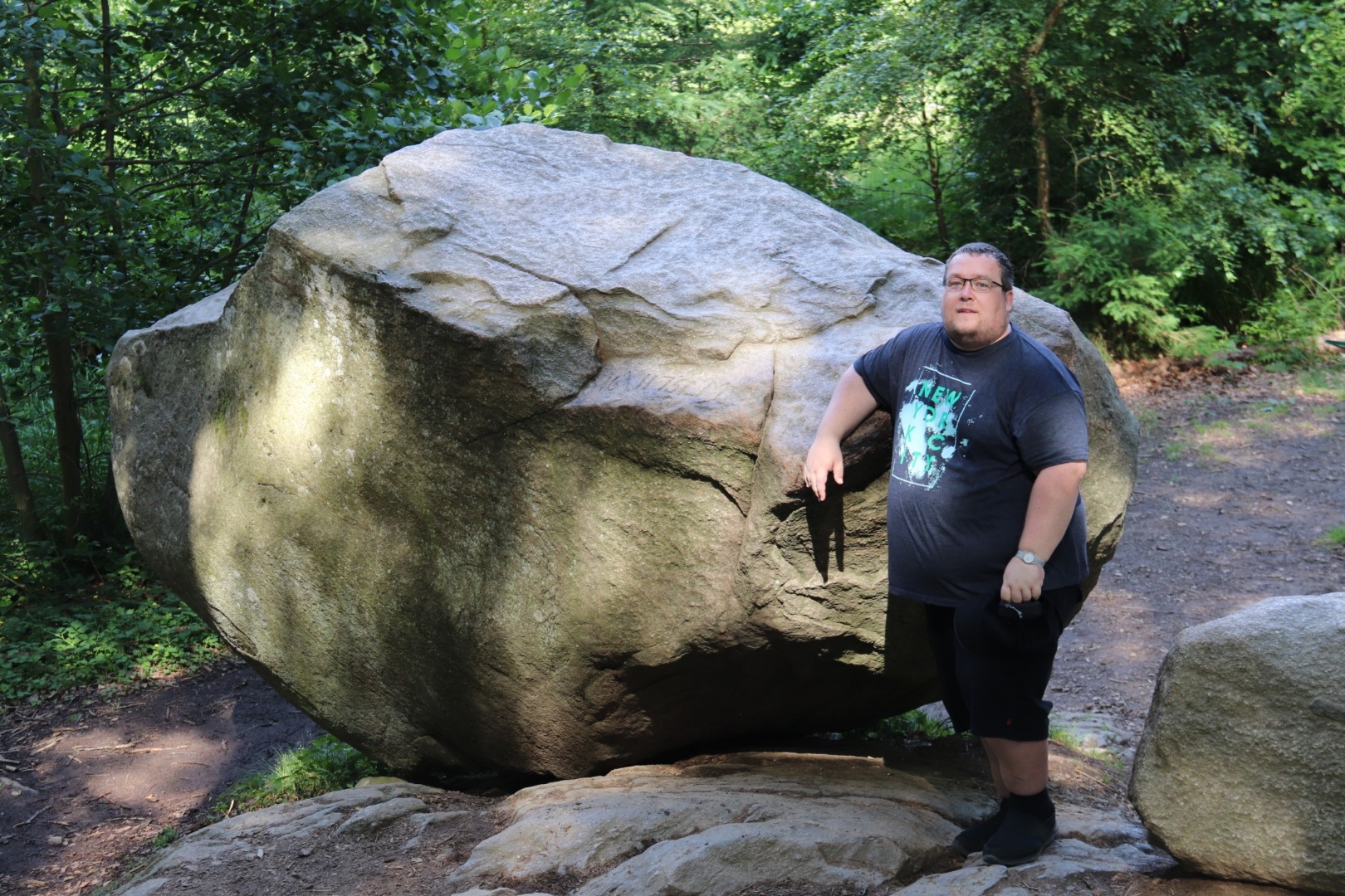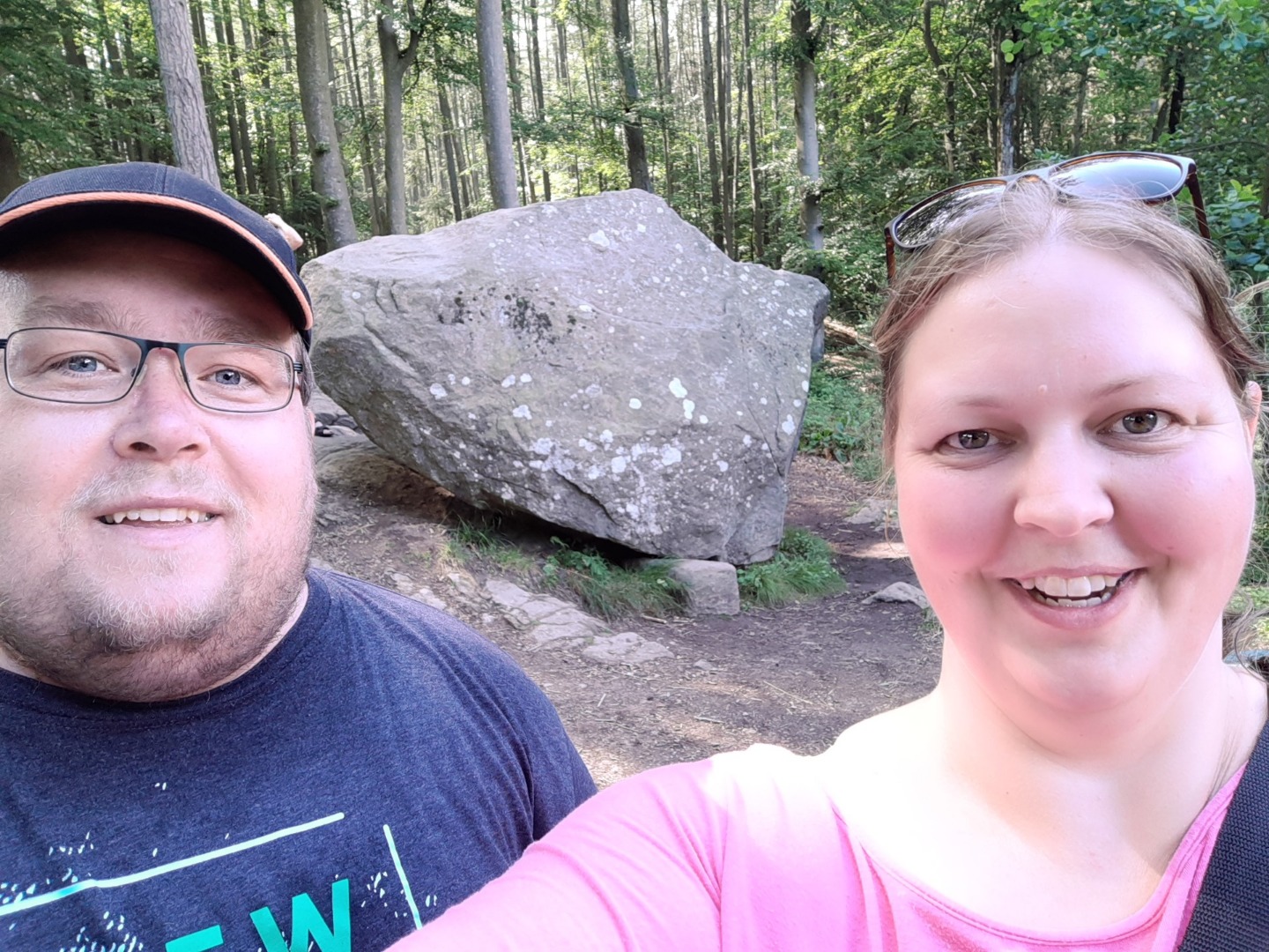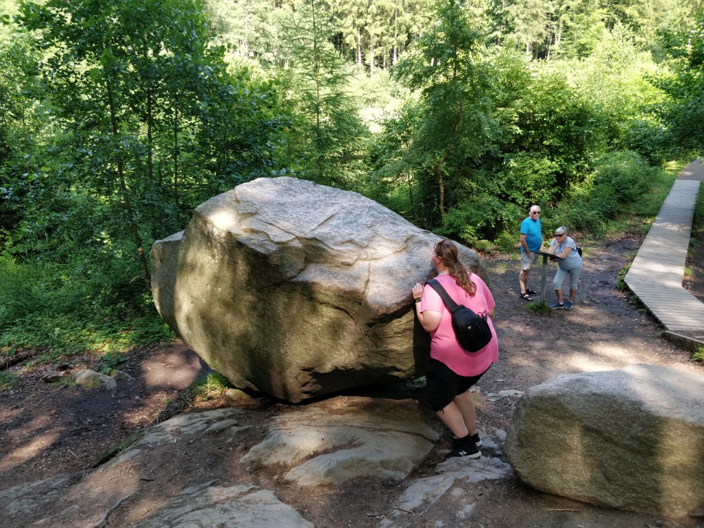 Efter vores bison-eventyr kørte vi mod Paradisbakkerne nær Nexø, for at se den "rigtige" rokkesten. Der er åbenbart flere rokkesten på Bornholm - men nu vil vi se Rokkestenén! Det var vi ikke de eneste der ville... Vi har generelt bemærket, at der i løbet af de sidste par dage er kommet RIGTIGT MANGE turister til øen. Så vi er begge glade for, at vores Bornholms-tur er ved at være slut. Men parkeringspladsen ved Rokkestenen var i hvert fald fuld. Så vi måtte parkere langs vejen i stedet. På vej ind til Rokkestenen havde vi læst, at man kunne skyde genvej ved at gå til venstre, på et eller andet tidspunkt... Men det var TYDELIGVIST ikke der hvor vi valgte at gå til venstre. Vi kom ud på en sti (hvis man kan kalde den det), som gik i svært fremkommeligt terræn, op og ned, ad klipper og bakker i skoven, med trærødder som hele tiden prøvede at spænde ben for os. Vi var lige ved at give op, men fortsatte alligevel frem, indtil vi - omsider og heldigvis - nåede Rokkestenen. Vi fik taget de obligatoriske billeder, og Thomas var lige ved at vælte Rokkestenen omkuld i sit forsøg på at rokke den. På tilbagevejen fulgte vi den afmærkede rute, som gik ad en næsten plan grussti, hele vejen tilbage til parkeringspladsen...!!!